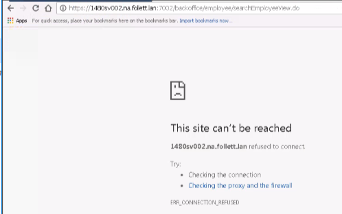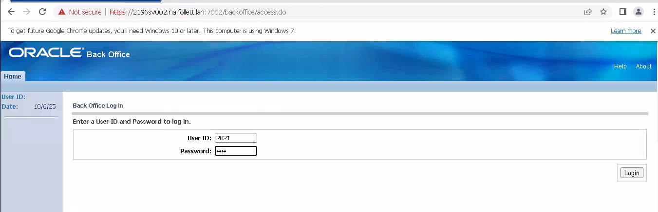 Connectivity check: Attempt to Access Stores Back Office through Frasadmin. Change the store number https://2196sv002.na.follett.lan:7002/backoffice/access.do